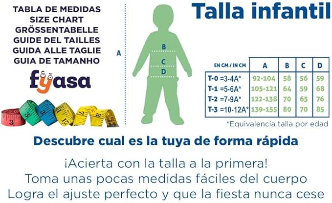 Este disfraz infantil de capibara está disponible en varias tallas para adaptarse a diferentes edades: 3 a 4 años, 4 a 6 años, 7 a 9 años y 10 a 12 años. Se recomienda revisar la guía de medidas para elegir la talla más adecuada y asegurar un ajuste cómodo.